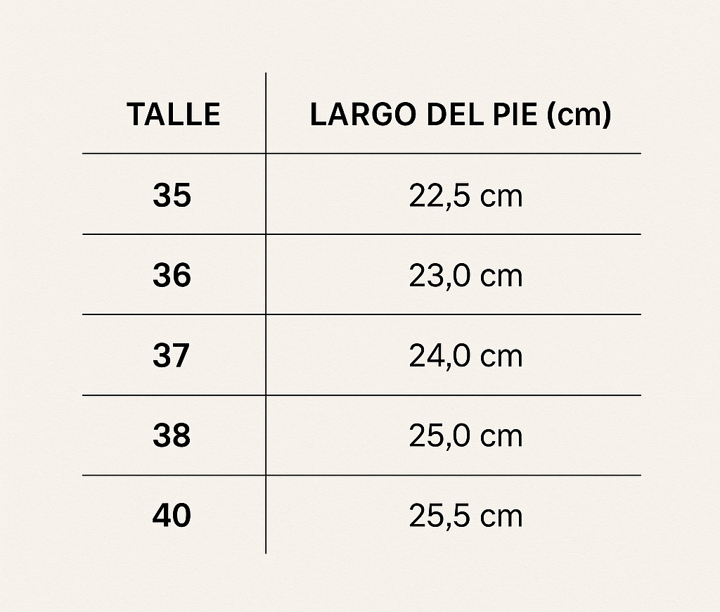 Podés guiarte con nuestra tabla de talles con medidas en cm. Te recomendamos medir tu pie desde el talón hasta la punta del dedo más largo y comparar con la guía.